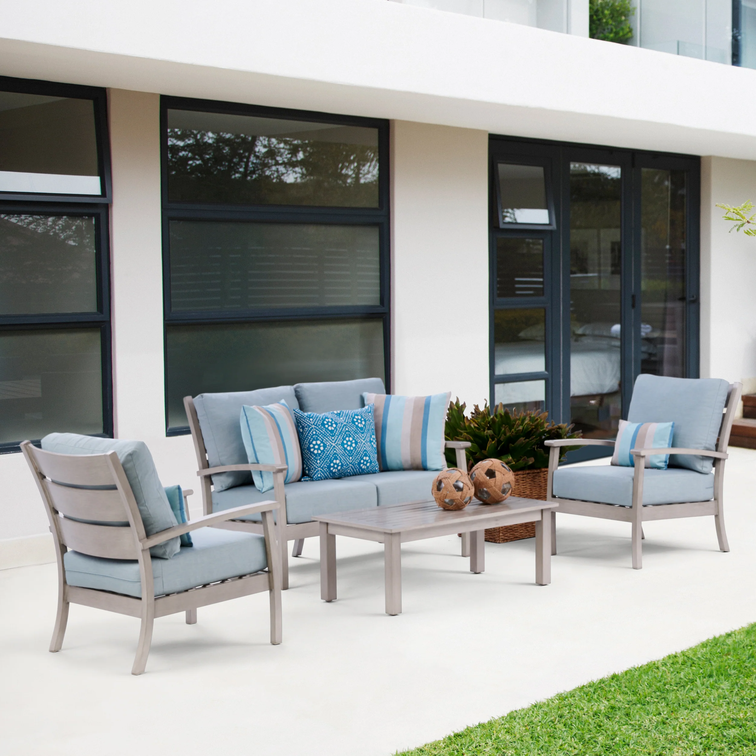 A modern twist on a classic, the Eden has a faux weathered teak finish and a rust-proof aluminum frame to give the word "timeless" a whole new meaning. Our Sofa Set with Fixed Chairs is great for entertaining a group or lounging by your lonesome with a book.