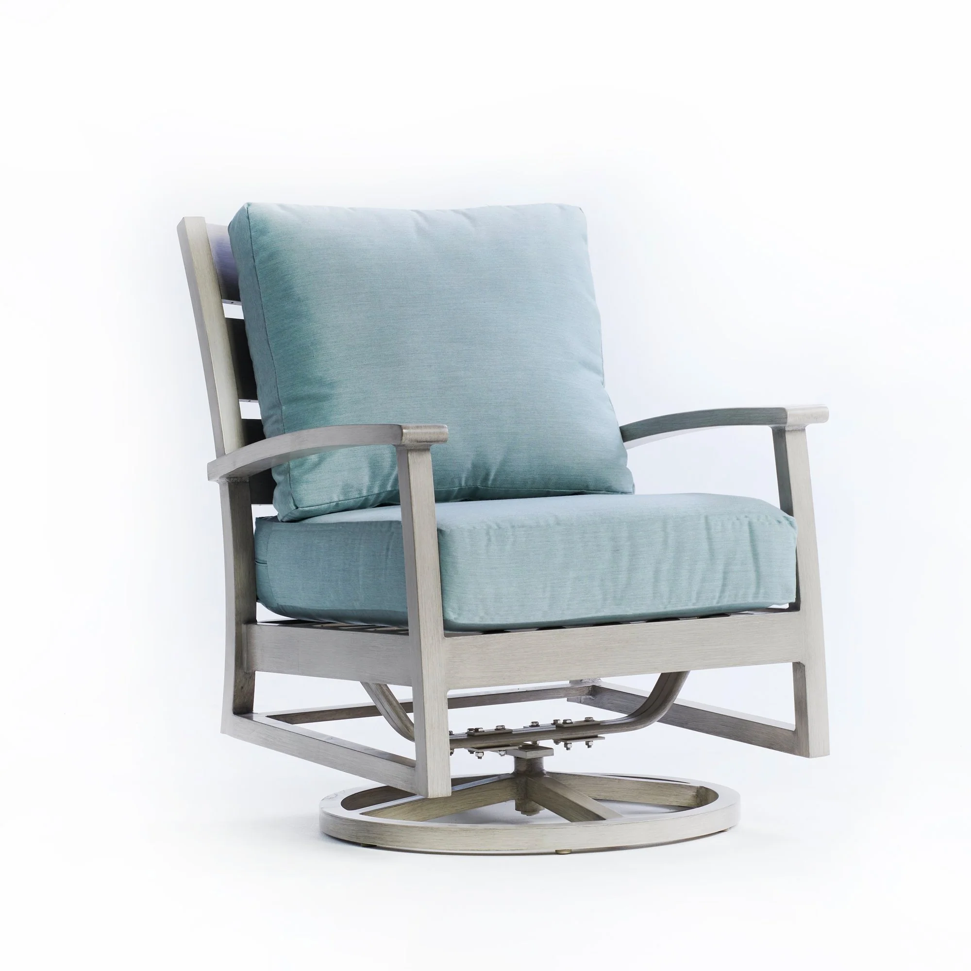 A modern twist on a classic set, the Eden Collection has a faux weathered teak finish and commercial grade rust-free frame to give the word timeless a whole new meaning. Our Eden Swivel Rocking Chair is a great addition to our Eden offering or a stand-alone in your yard.
